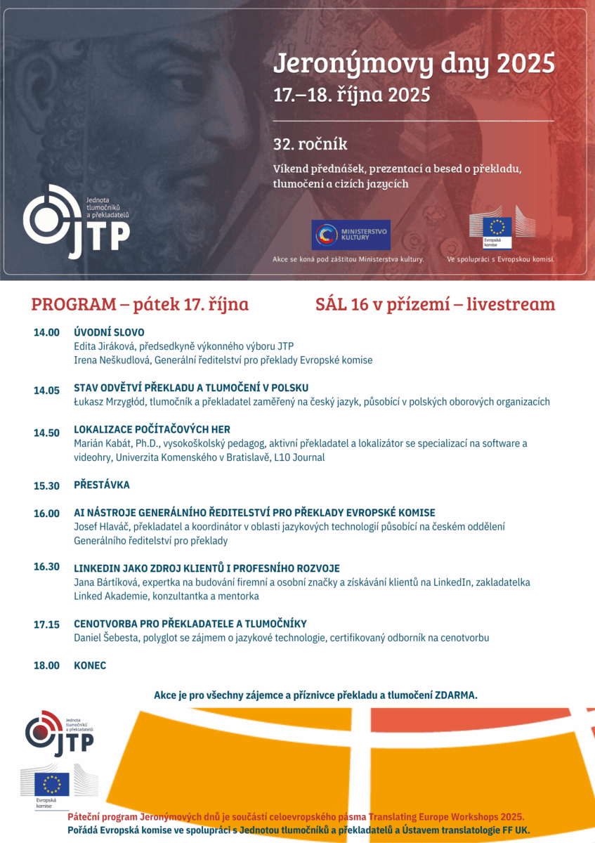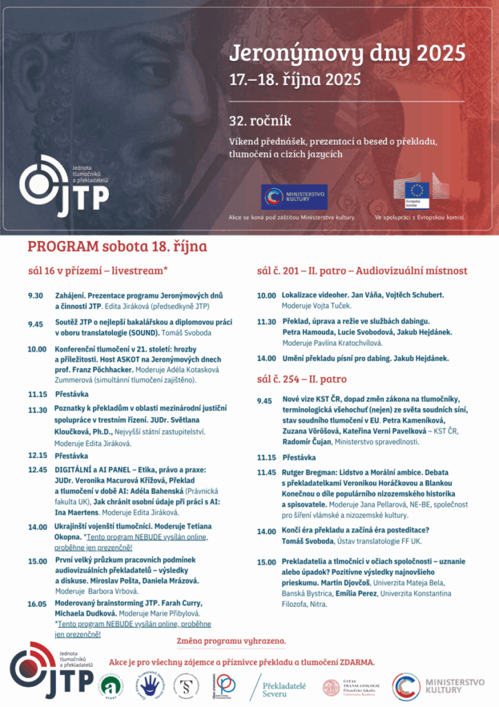 Sobotní program, na němž se kromě JTP podílejí také ostatní v Česku působící organizace sdružující překladatele a tlumočníky, najdete ZDE.
