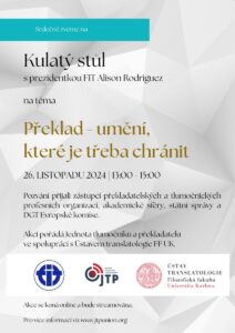 U příležitosti návštěvy prezidentky Mezinárodní federace překladatelů FIT pořádá Jednota tlumočníků a překladatelů ve spolupráci s Ústavem translatologie FFUK kulatý stůl na téma Překlad, umění, které je třeba chránit.